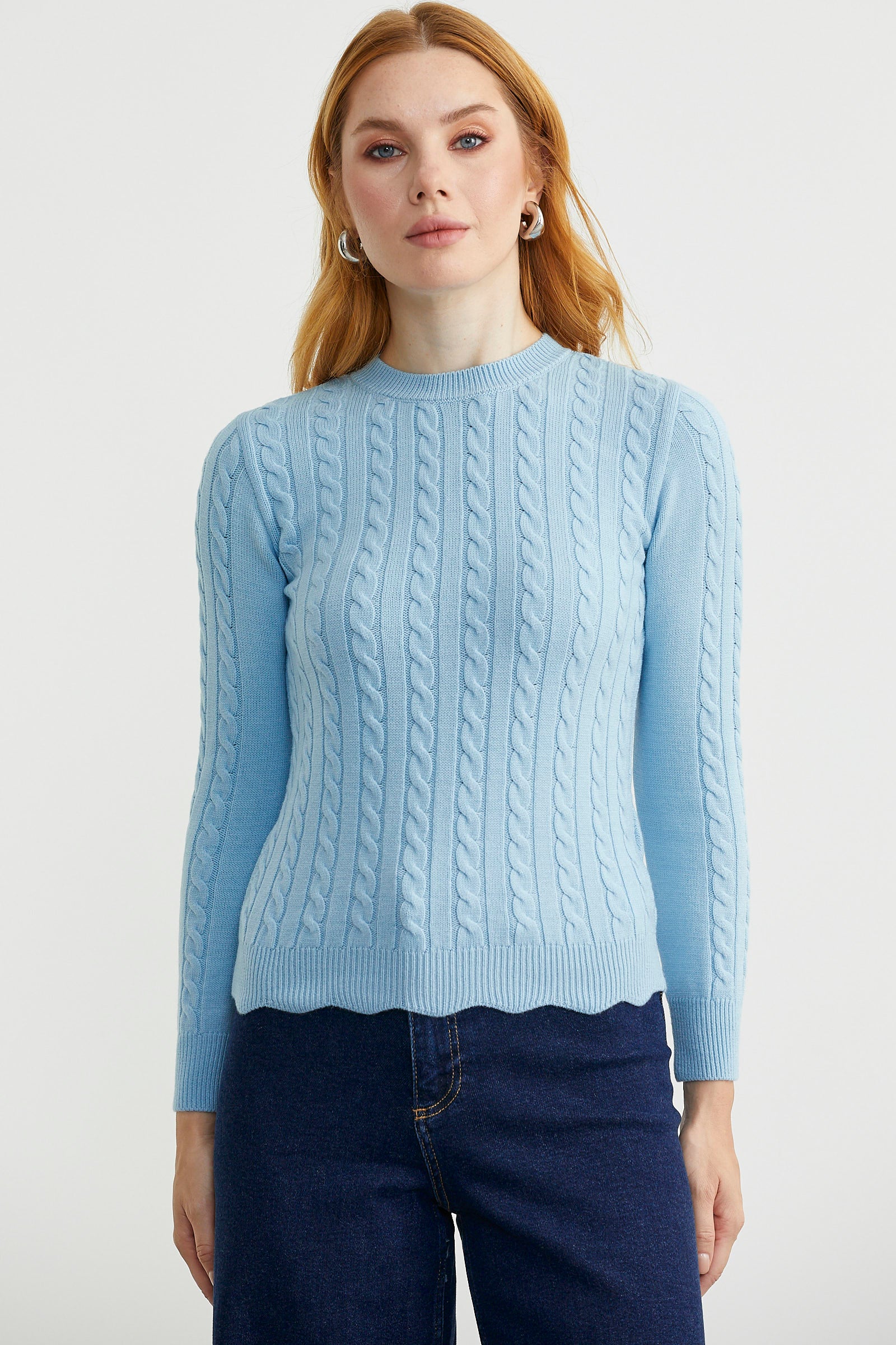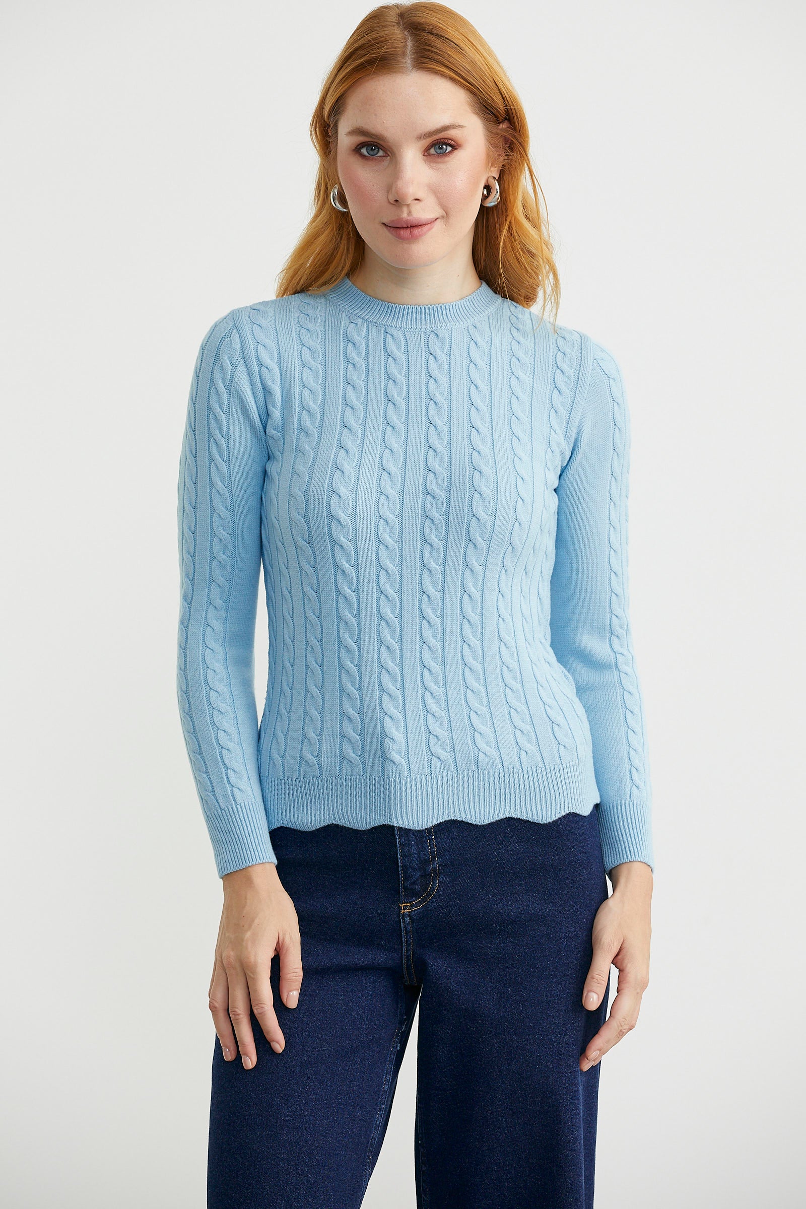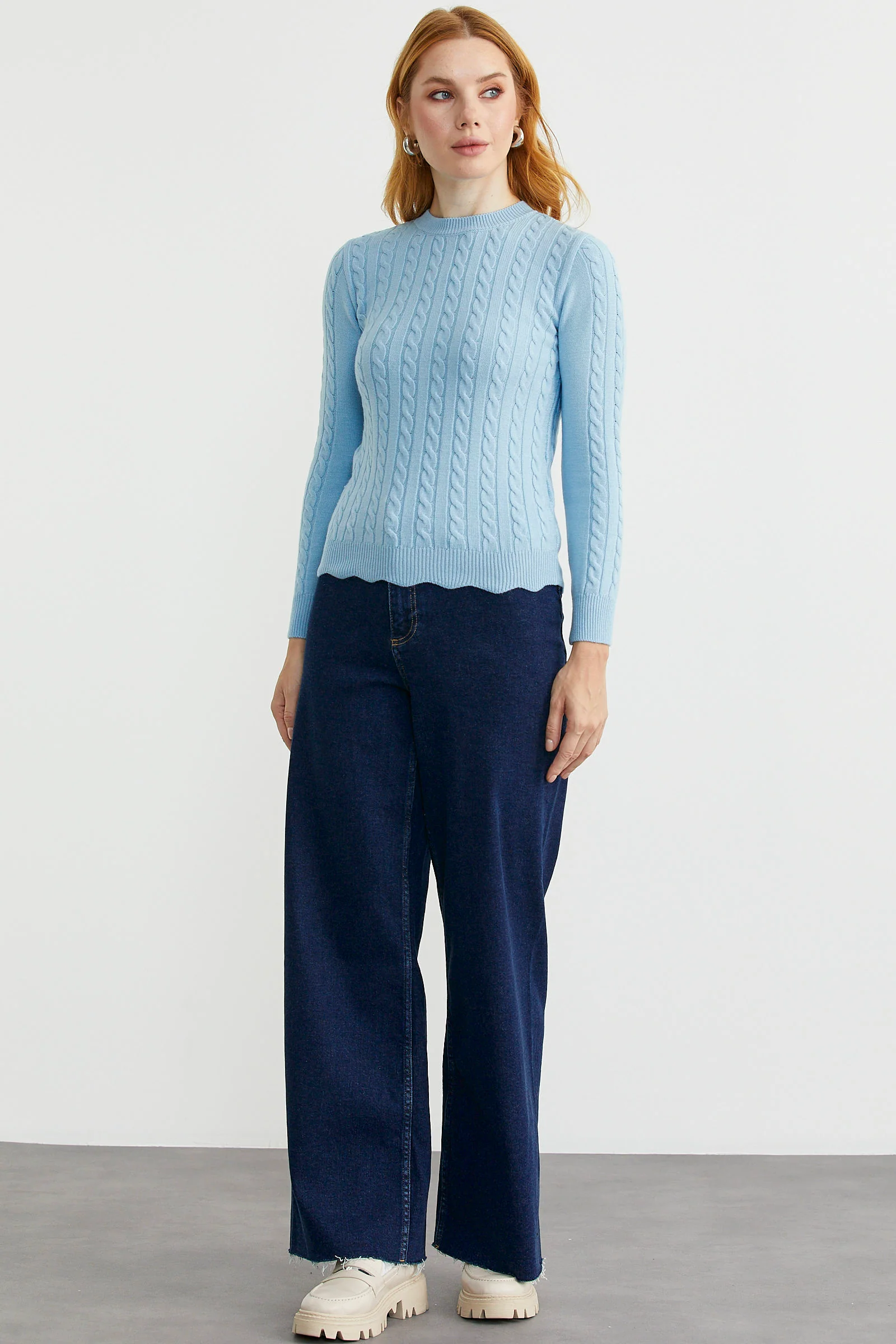 Dilimli Saç Örgülü Triko Kazak – Mavi