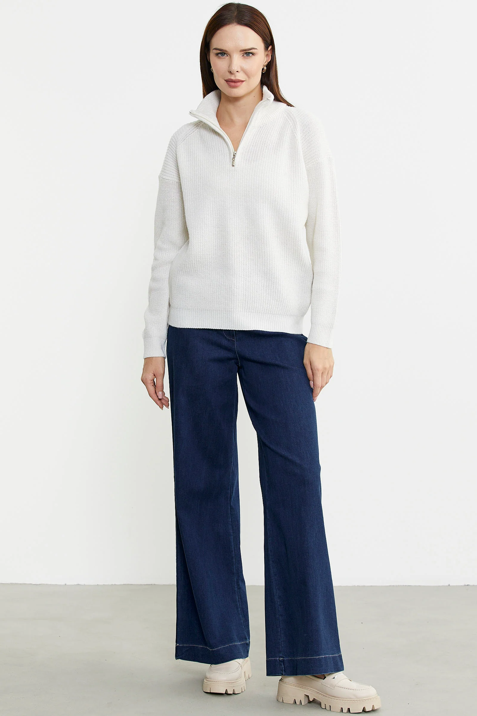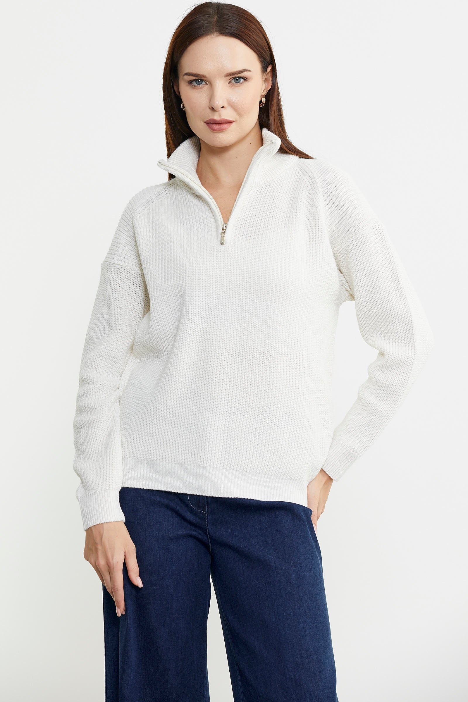 Yün karışımlı iplikten üretilmiş, uzun kollu, yarım balıkçı yaka, üstü fermuar kapamalı triko kazak.